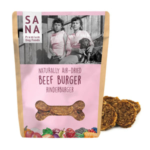 Les burgers de boeuf SANADOG sont une délicatesse pour votre chien, composée de viande de boeuf pure et de haute qualité. Ils sont fabriqués sans additifs tels que le maïs, le blé, le soja, les colorants, les conservateurs, les farines de viande ou d'autres agents de remplissage dans notre propre atelier et sont délicatement séchés à l'air. Notre technologie de séchage à l'air est une interprétation moderne des techniques séculaires de conservation de la viande.