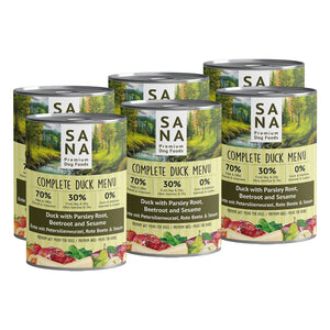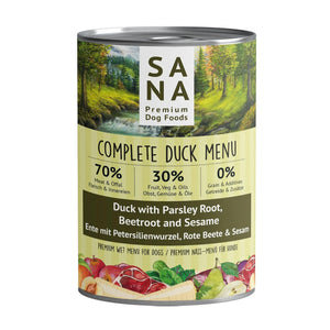 42% de viande de canard, 16% de cœurs de canard, 12% d'os de poitrine de canard, 5% de racine de persil, 5% de betterave rouge, 5% d'épinards, 5% de poire, 5% de pomme, 1,5% de pêche, 1,5% d'huile de colza, 0,9% de cynorrhodon, 0,6% de calcaire d'algues, 0,3% de sésame, 0,2% de farine d'algues marines.