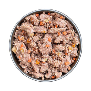 Pour notre menu frais au porc, nous utilisons exclusivement des ingrédients frais de qualité alimentaire dans notre propre atelier. De la viande de porc de qualité et des oreilles de porc sont cuites lentement à basse température. Ce n'est qu'après cela que nous ajoutons du sarrasin cuit, des carottes blanchies, de la citrouille, des pommes, de l'huile de lin, des cynorhodons, de la chaux d'algues, de la levure de bière, de la farine d'algues marines et du fenouil au repas cuit. Cela permet de préserver de manière optimale la saveur et les nutriments des ingrédients frais.