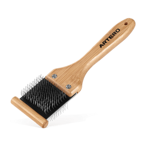 La brosse polyvalente ultime Côté noir pour démêler le pelage et enlever les poils morts Côté gris pour étirer et ouvrir le pelage Fabriqué de manière écologique en bambou Spécialement conçu pour brosser et démêler les chiens et les chats de tous types Emballage en carton recyclable Mode d'emploi : tenir la brosse par le manche et présenter l'une des faces avec les dents sur le pelage, faire glisser les dents le long du pelage dans la direction du manche. Répéter sur l'ensemble du pelage. Pour étirer, il est recommandé de brosser à rebrousse-poil. Lorsque beaucoup de poils sont piégés entre les dents, il est conseillé de les enlever avec les mains ou un peigne.