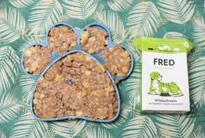 41% sanglier* (chair musculaire), pommes de terre* (25%), eau* (20%), carottes* (4,5%), courgettes* (4,5%), pomme* (2,5%), huile de lin*, huile de chardon*, enveloppes de psyllium*, minéraux